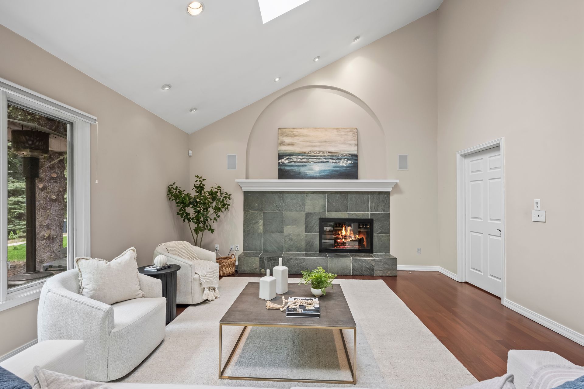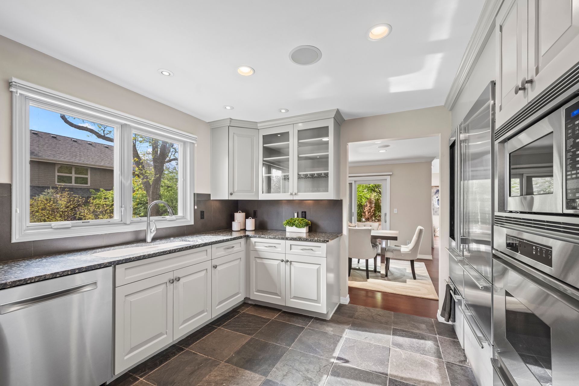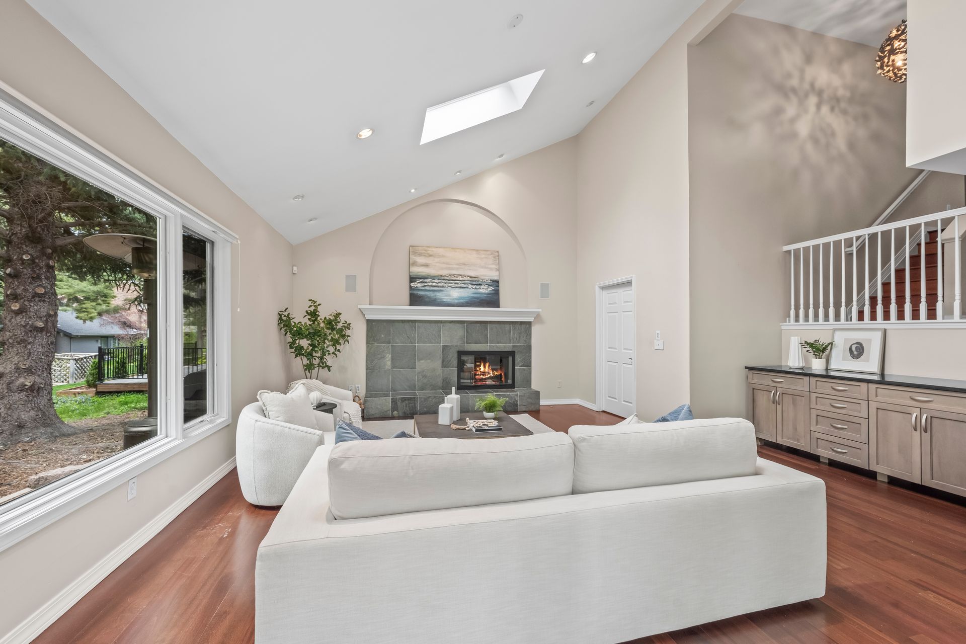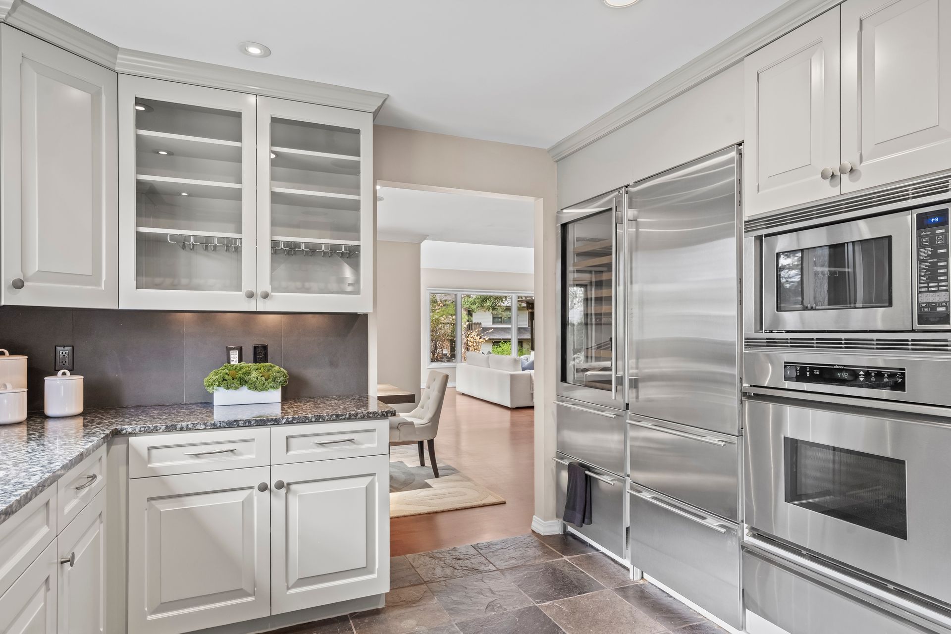 The spacious main-level features timeless architecture complemented by modern updates and an open-concept design connecting the living, dining areas creating an inviting atmosphere. The kitchen is a Chef's delight equipped with high-end appliances including a Viking gas stove & hood, Dacor oven & warming drawer, Sub-Zero refrigerator with beverage fridge, custom cabinetry, solid surface counters & stone backsplash. The dining area is open to an expansive living room with vaulted ceilings, picturesque windows, gas fireplace with stone surround & hearth & multiple sliders to the back & side patios.