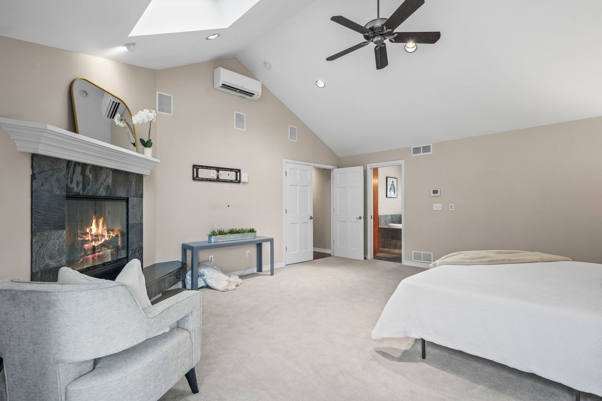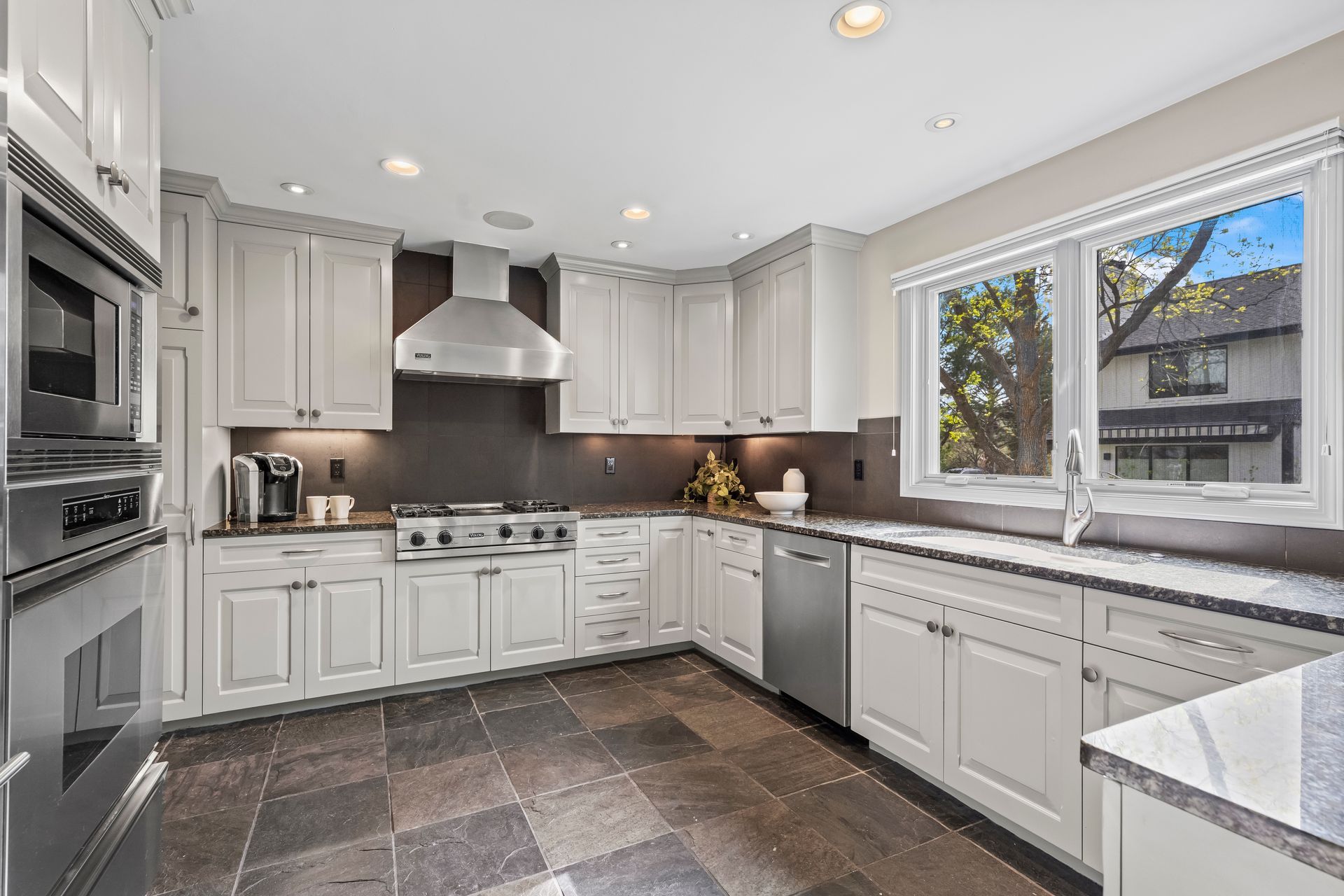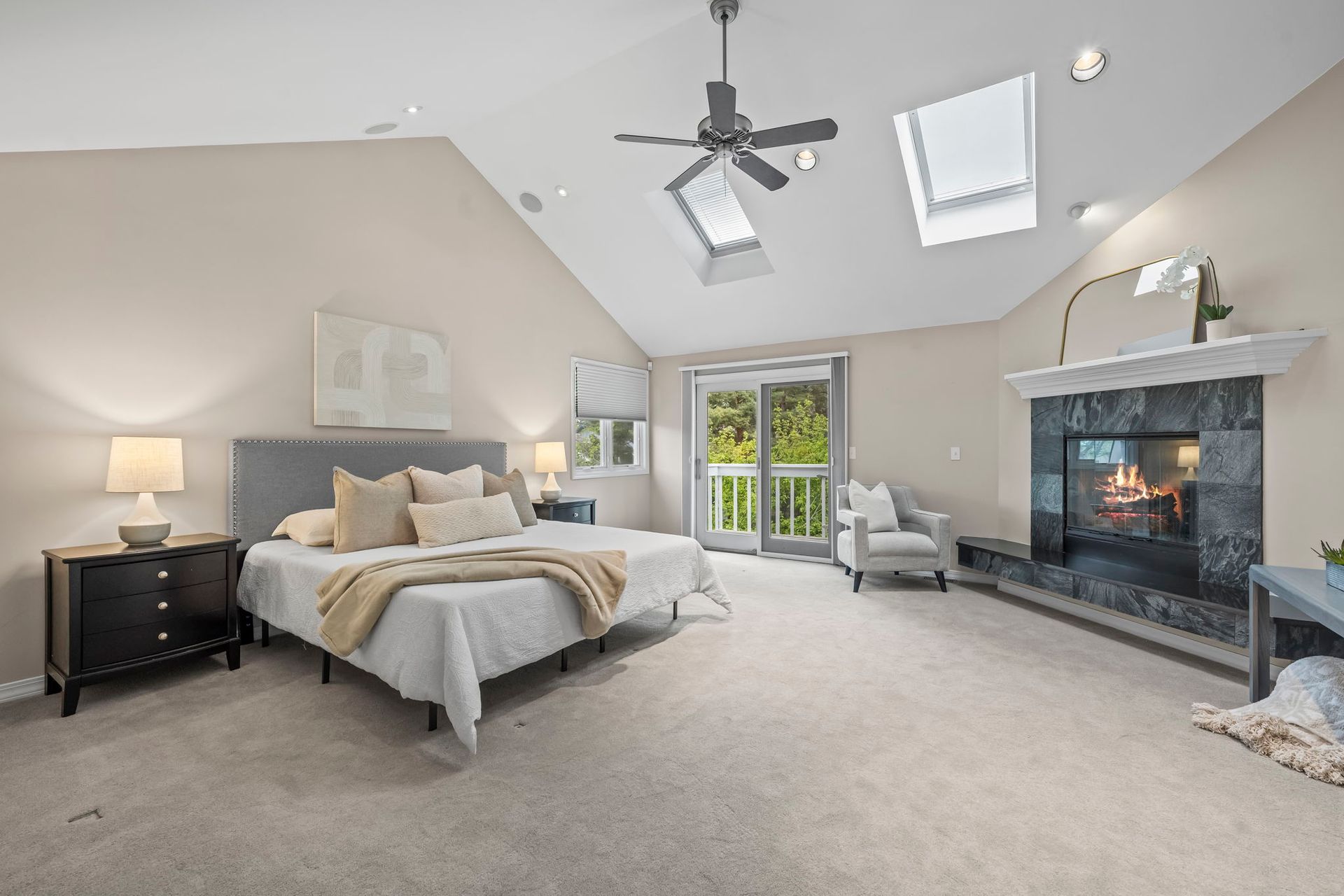 The spacious main-level features timeless architecture complemented by modern updates and an open-concept design connecting the living, dining areas creating an inviting atmosphere. The kitchen is a Chef's delight equipped with high-end appliances including a Viking gas stove & hood, Dacor oven & warming drawer, Sub-Zero refrigerator with beverage fridge, custom cabinetry, solid surface counters & stone backsplash. The dining area is open to an expansive living room with vaulted ceilings, picturesque windows, gas fireplace with stone surround & hearth & multiple sliders to the back & side patios.