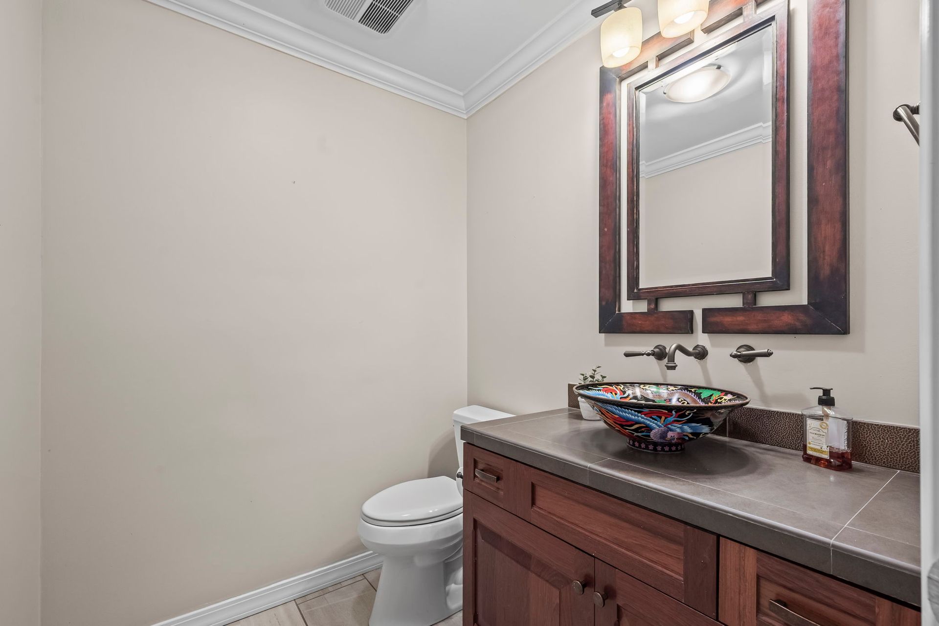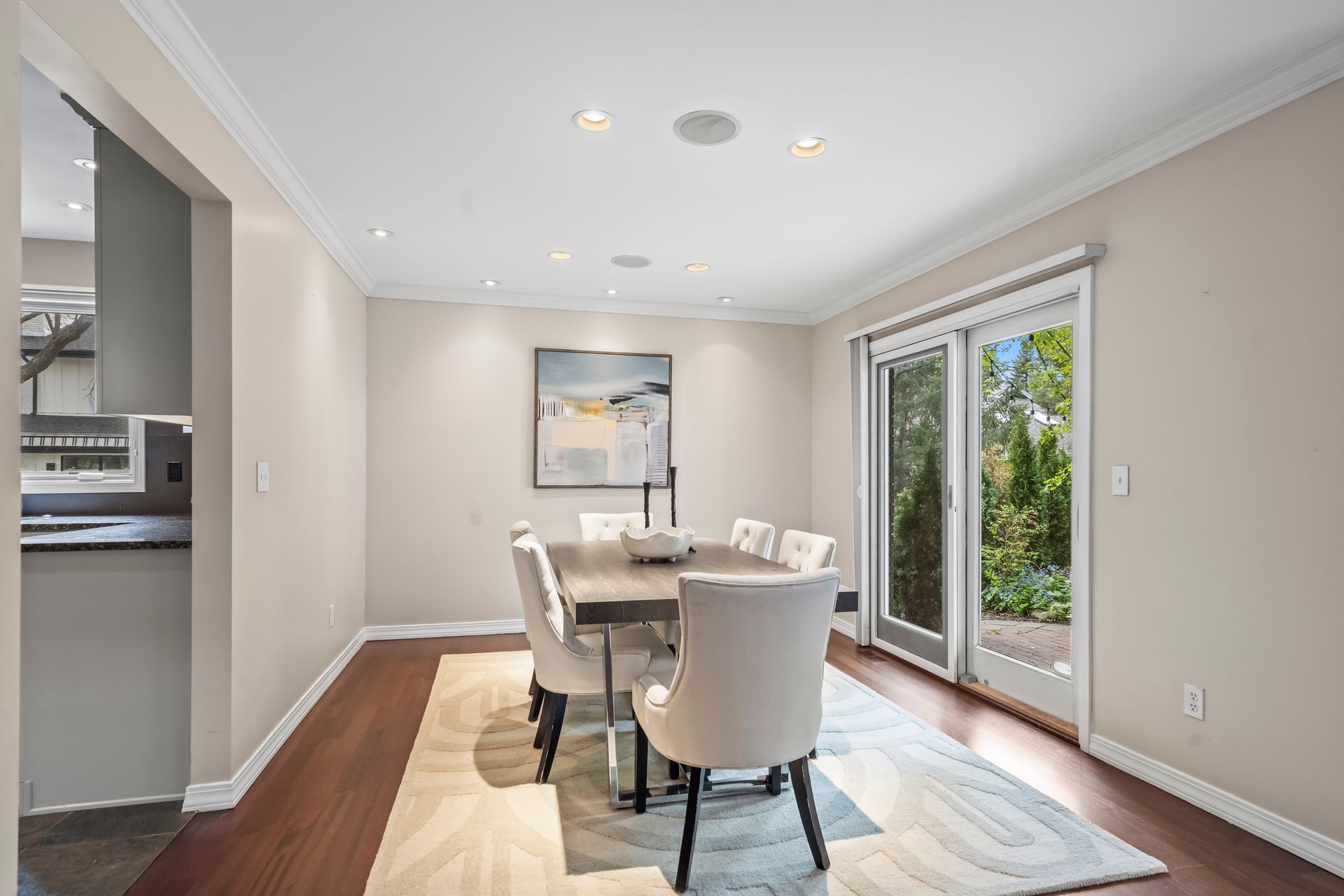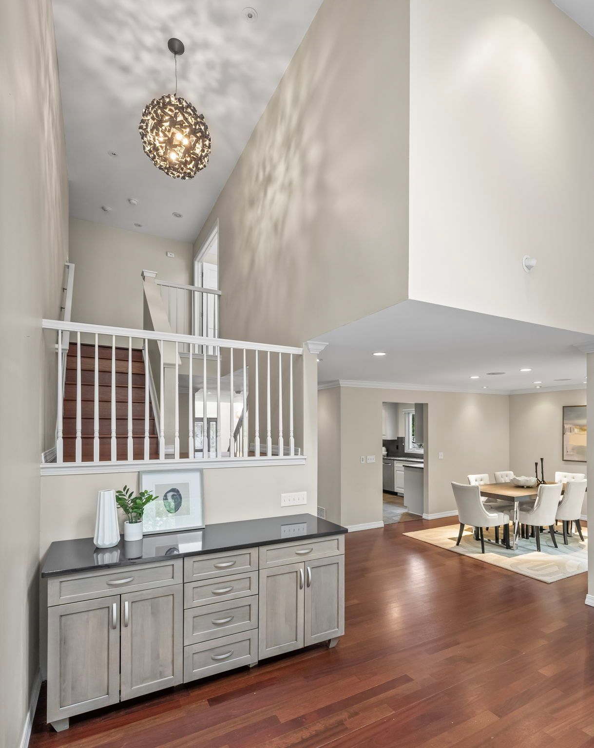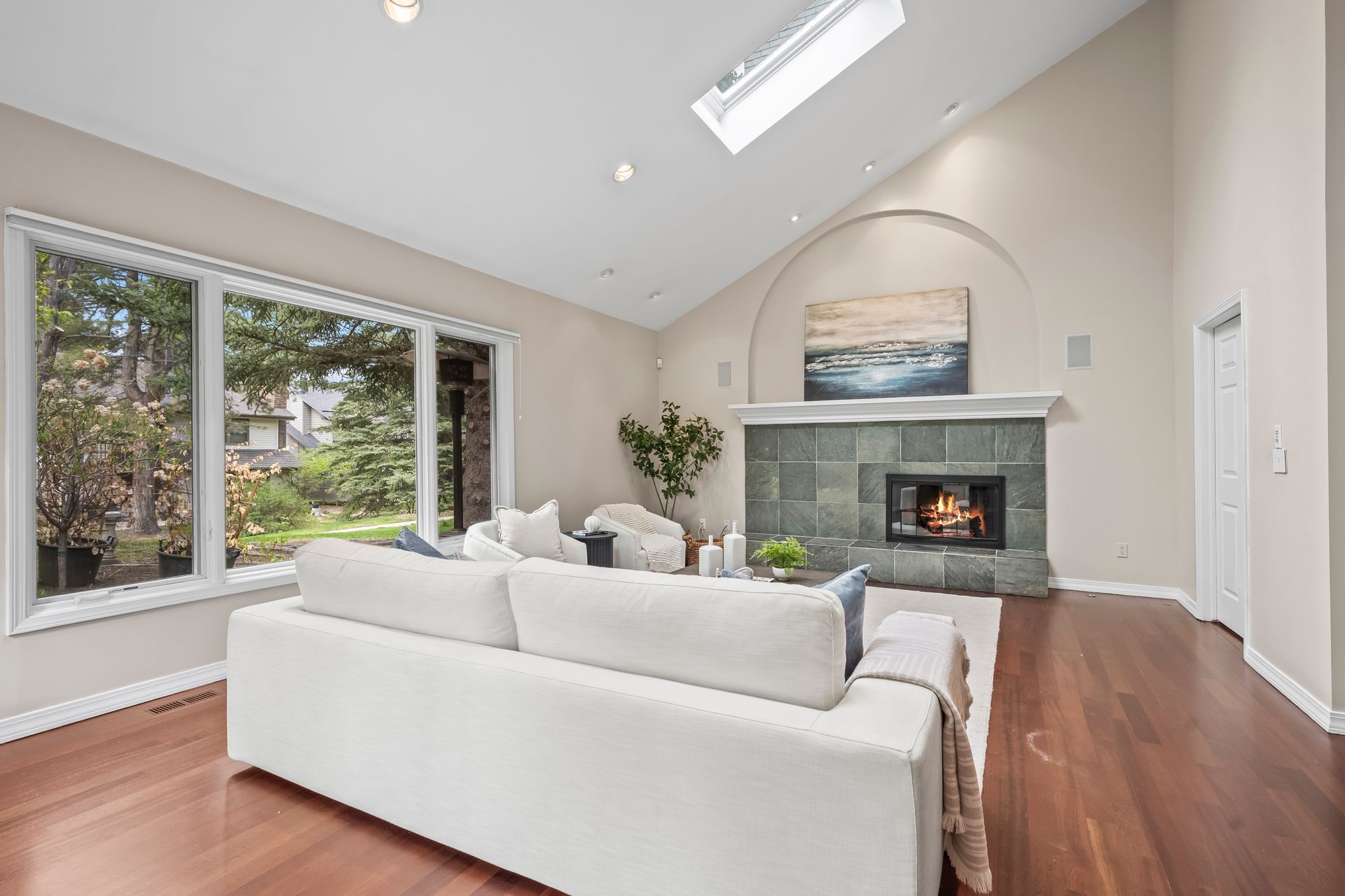 The spacious main-level features timeless architecture complemented by modern updates and an open-concept design connecting the living, dining areas creating an inviting atmosphere. The kitchen is a Chef's delight equipped with high-end appliances including a Viking gas stove & hood, Dacor oven & warming drawer, Sub-Zero refrigerator with beverage fridge, custom cabinetry, solid surface counters & stone backsplash. The dining area is open to an expansive living room with vaulted ceilings, picturesque windows, gas fireplace with stone surround & hearth & multiple sliders to the back & side patios.